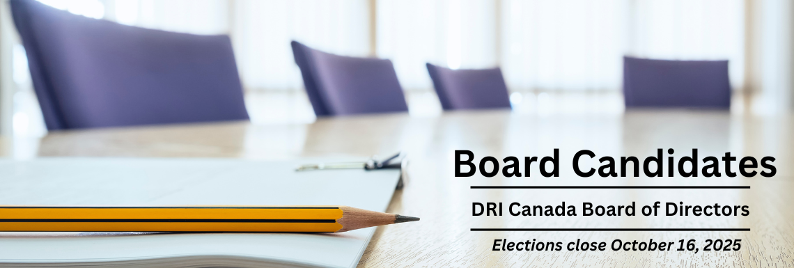 An election will be held from September 29-October 16, 2025 for the Director at Large positions. All DRI Canada certified professionals are eligible to vote in this election. Please log into your profile to place your vote.